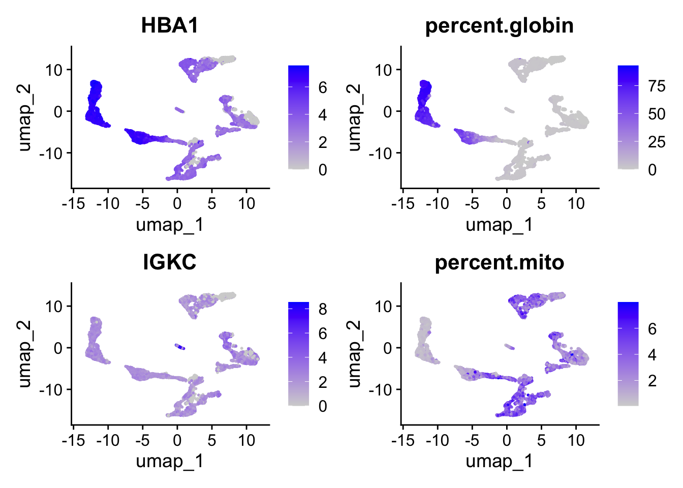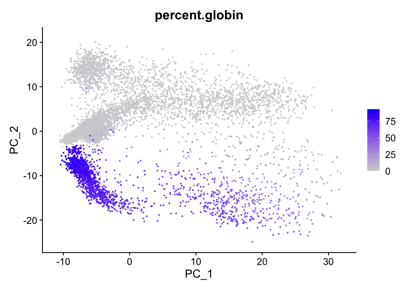 Seurat::FeaturePlot(seu, reduction = "pca", features = "percent.globin")Warning: The `slot` argument of `FetchData()` is deprecated as of SeuratObject 5.0.0.