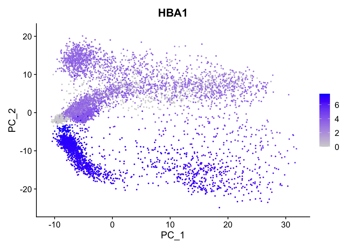 Seurat::FeaturePlot(seu, reduction = "pca", features = "HBA1")