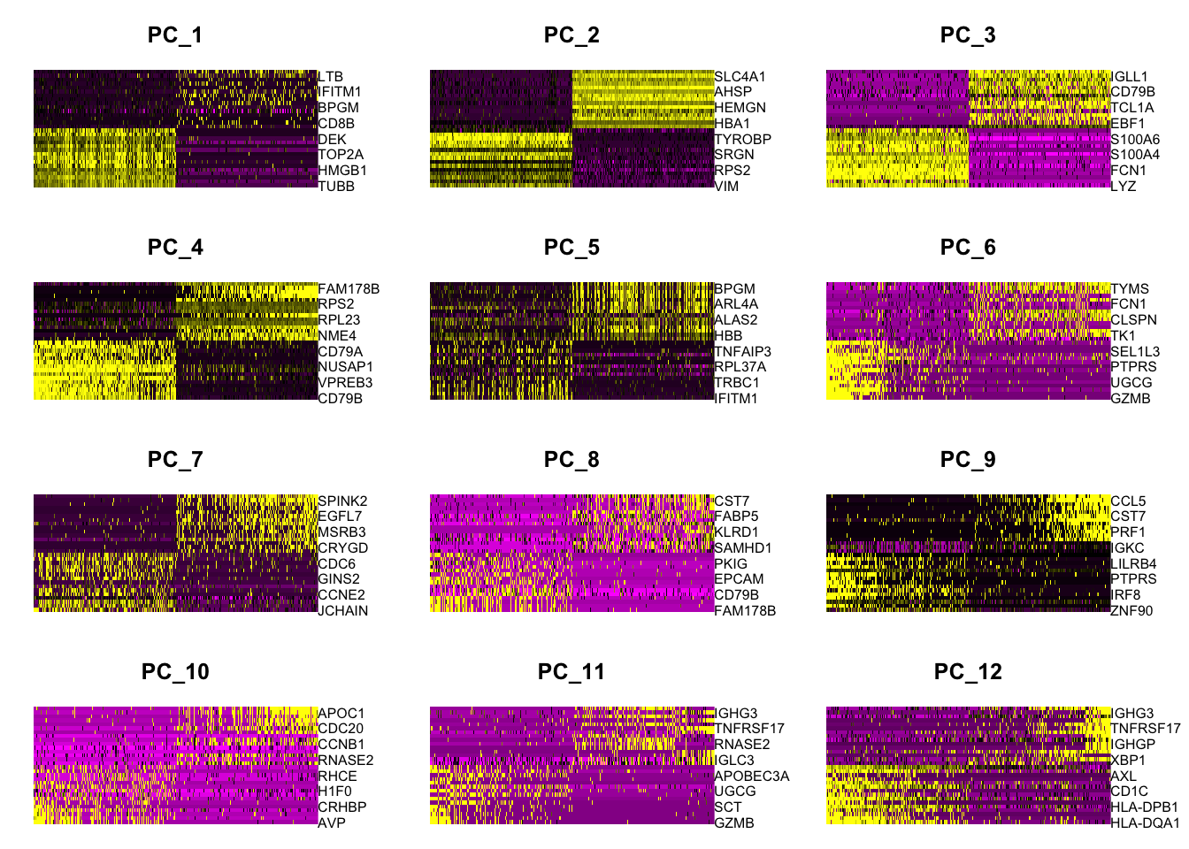 Seurat::DimHeatmap(seu, dims = 1:12, cells = 500, balanced = TRUE)