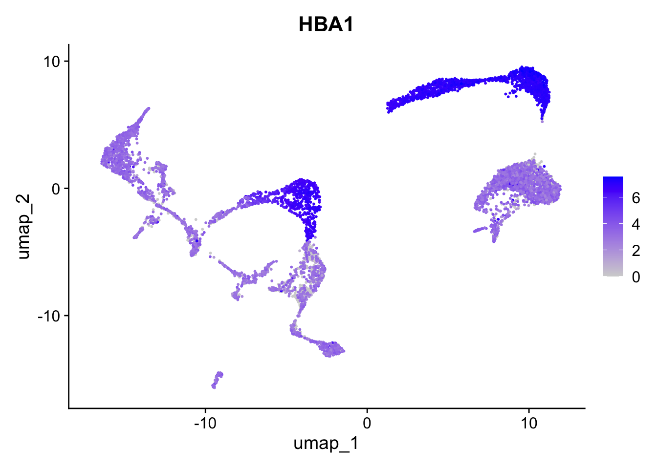 Seurat::FeaturePlot(seu, "HBA1")Warning: The `slot` argument of `FetchData()` is deprecated as of SeuratObject 5.0.0.