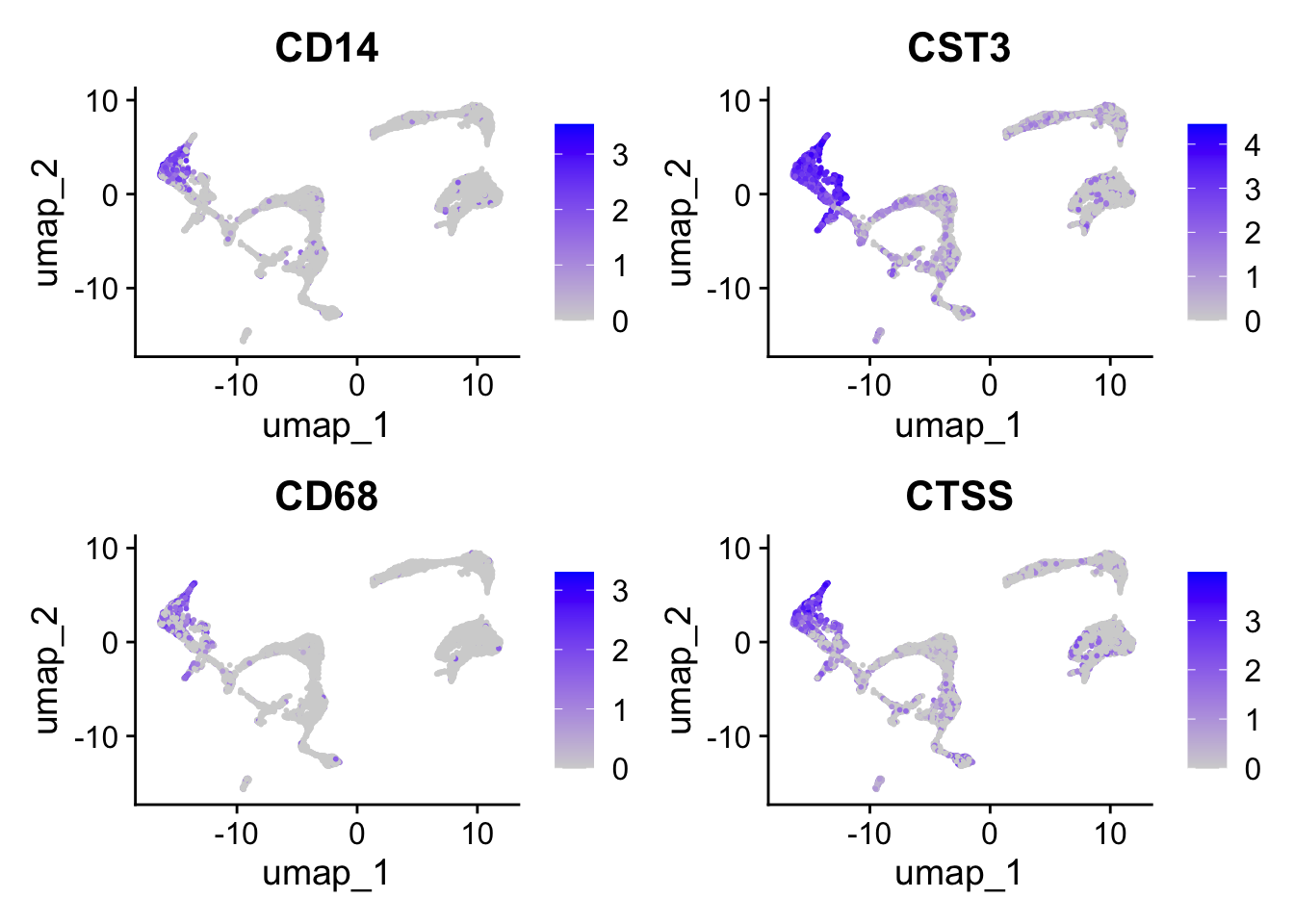 Seurat::FeaturePlot(seu, monocyte_genes, ncol=2)